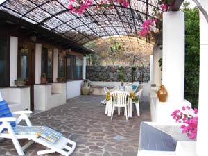 in pietra dove lateralmente si trovano molte aioule piene di fiori. La villa è composta da un grande soggiorno a vetri con zona cucina, bagno con doccia, camera matrimoniale con terzo letto e finestra, 2 camerette ciascuna con un letto singolo; antistante al soggiorno un ampio terrazzo coperto ed attrezzato con vista laterale su Vulcano, spazio