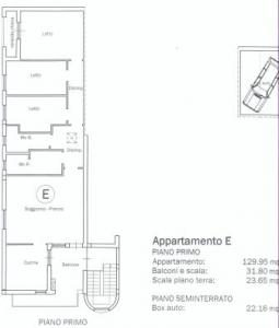 - Appartamento D: situato al primo piano di 118 mq composto da ingresso su soggiorno composto da ingresso, cucinino con zona pranzo, 2 camere da letto, 2 bagni + ampia veranda di 62 mq + mq di box auto;